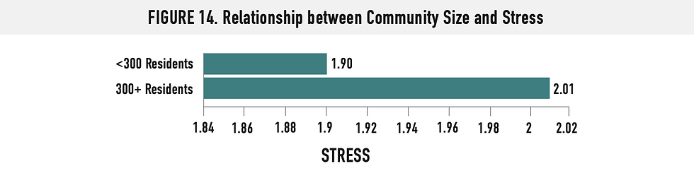 • COMMUNITY SIZE: Respondents of smaller communities (300 or fewer residents in independent living) were less likely to be stressed compared to residents of communities with more than 300 residents in independent living (<300 residents=1 .9; 300+ residents=2 .0) (see Figure 14) .